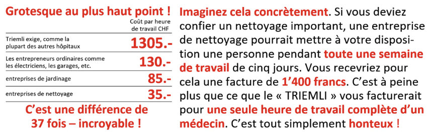 Lors de votre prochaine visite chez le médecin, regardez précisément l’heure au moment où vous entrez dans le cabinet, puis retenez l’heure à laquelle vous en sortez. Quand la copie de la facture arrive, calculez quel tarif horaire vous a été facturé pour votre visite. À ce moment-là, vous sentirez à quel point le système actuel est injuste. Comparez aussi ce tarif avec votre propre salaire – vous serez stupéfait ! Un regard sur la page de mes Expériences avec ce secteur vous ouvrira également les yeux.