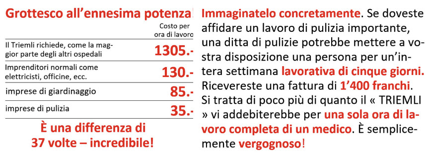 Durante la prossima visita medica fate attenzione all’orario esatto in cui entrate nello studio e ricordate l’ora in cui lo lasciate. Quando in seguito arriverà la copia della fattura, calcolate quale salario orario vi è stato addebitato per la vostra visita. In quel momento sentirete quanto sia ingiusto il sistema attuale. Confrontate questo importo anche con il vostro salario – resterete sbalorditi! Anche uno sguardo alla pagina delle mie Esperienze con questo settore vi aprirà gli occhi.